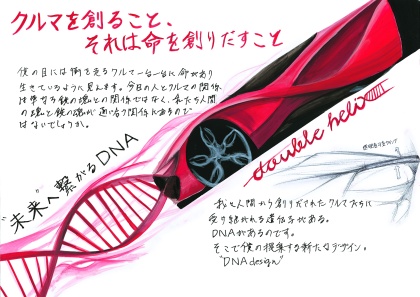 【講評】ものづくりにこだわるカーデザイナーの心意気は、自動車に魂を吹き込むための行為であり、その鼓動を作者は感じて受け継がれるDNAとし、二重螺旋を造形テーマに持ち込んだ。フロントエンドからリアーのスポイラーまでバランスよく造形し、まとめている点が評価された。又、細部まで手を抜くことなく描き込み、フロントやリアーの造形も全体のテーマを生かしながらユニークな形状で統一感を持たせ、それぞれの見せ場を特徴付けている。