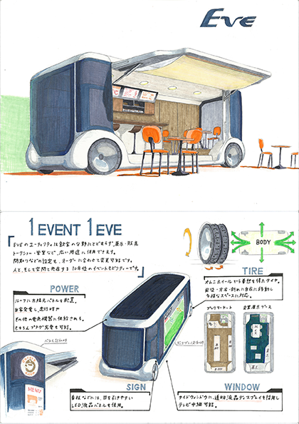 【講評】一見、救急車のようにも見える外観は、自動運転のため窓が無く、外観デザインの特徴となっている。これから日本が直面する超高齢化社会において、過疎化した地域へ病院ごと派遣するという発想が興味深い。車内に装備された薬剤師の代わりとなるAIロボットは機能的にデザインされている。またこの提案は、全自動の車椅子など、真剣にその時のシーンを考えた物の配置や機能のアイデアが随所に盛り込まれている。これからの日本の社会の変化を良く理解できている、好感のもてる提案がされています。