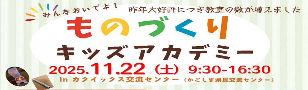 テーマ:昨年大好評をいただいた「キッズエンジニアKagoshima in 九州」が、2025年度は「ものづくりキッズアカデミー」として開催されます。 クルマの科学に触れながら、同時にものづくりを体感できる貴重な機会です。 半導体関連産業を中心とした製造業への興味や企業の魅力を発信するために、主に小・中学生とその保護者を対象に、ものづくりの魅力を体験できます。